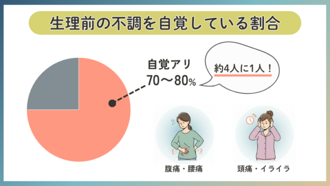 日本産婦人科学会によると、日本人女性の70~80%が生理前に何らかの不調を自覚していると言われています。