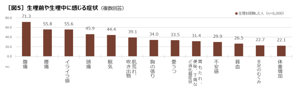 株式会社ツムラ(製薬会社)による2022年の調査では、生理前・生理中に感じる症状で最も多いのが「腹痛」、ついで「腰痛」となっています。